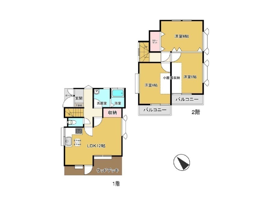 駐車スペース2台分!徒歩圏内にスーパーや小学校、病院が揃った便利な立地♪・全居室6帖以上、2面採光で陽当たり風通し良好・季節ものの収納等に便利な小屋裏収納・南に面したウッドデッキとバルコニー2面付き詳細お気軽にお問い合わせください♪